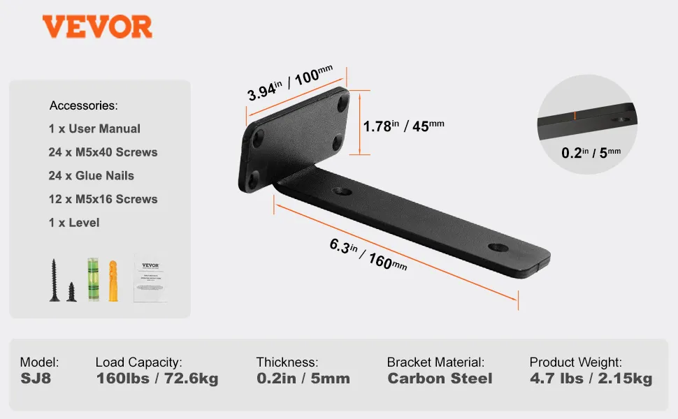 Le staffe di gestione dei carichi pesanti VEVOR sono progettate per gestire carichi pesanti. Con una capacità di 160 libbre, possono supportare un peso sostanziale. Ciò le rende adatte per contenere oggetti di grandi dimensioni come libri o utensili da cucina. La loro elevata capacità di carico assicura che i tuoi scaffali rimangano stabili e sicuri. È essenziale sia per la sicurezza che per la praticità. Puoi fidarti di queste staffe per tenere i tuoi oggetti senza preoccupazioni. Il loro design affidabile consente loro di resistere all'uso e all'usura quotidiani. Quindi, questo lo rende rassicurante per qualsiasi esigenza di scaffalatura.