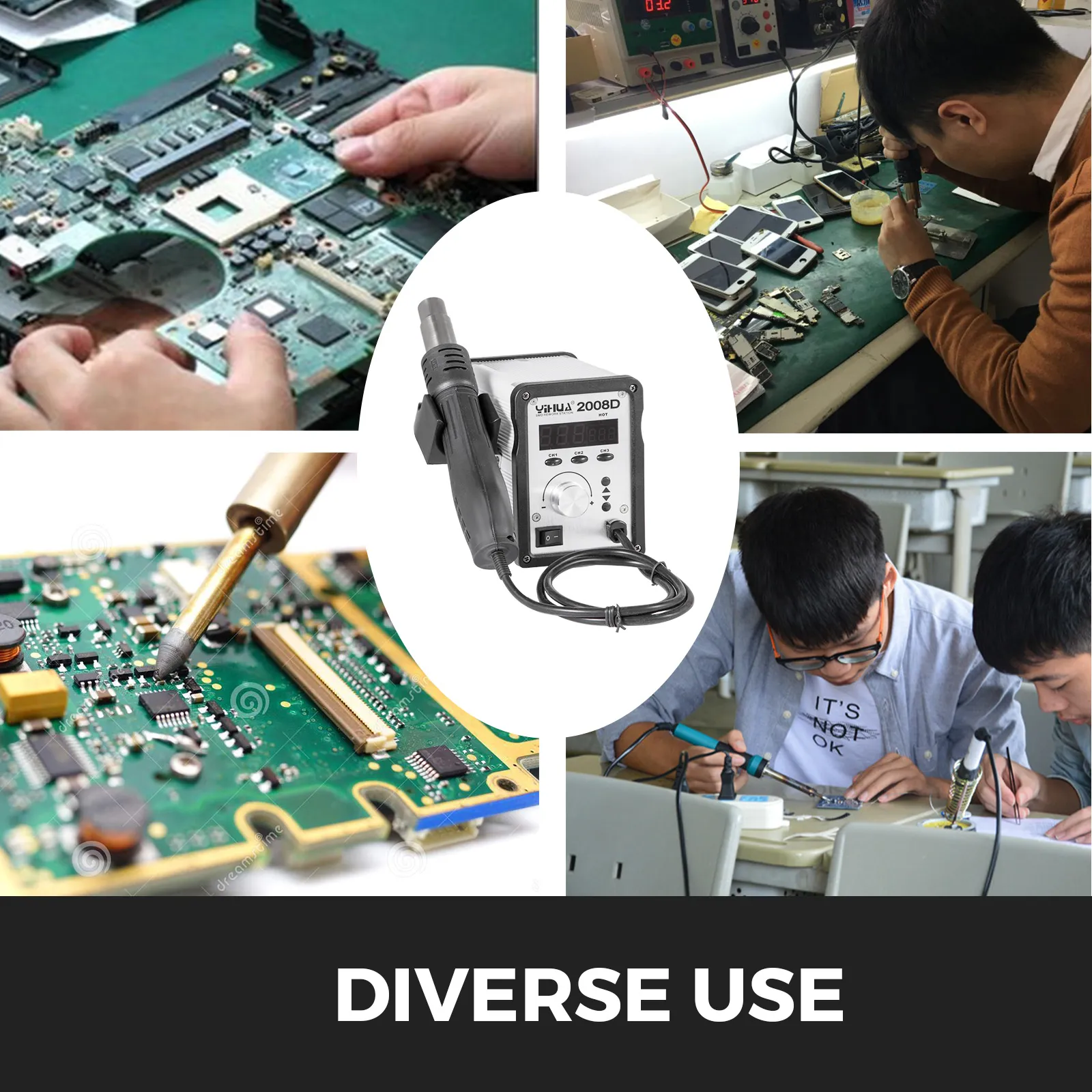 Progettato per dissaldare SOIC, CHIP, QFP, PLCC, BGA e altri componenti sensibili alla temperatura, strumento essenziale per la riparazione di telefoni cellulari, riparazione di laptop o saldatura di circuiti stampati.
