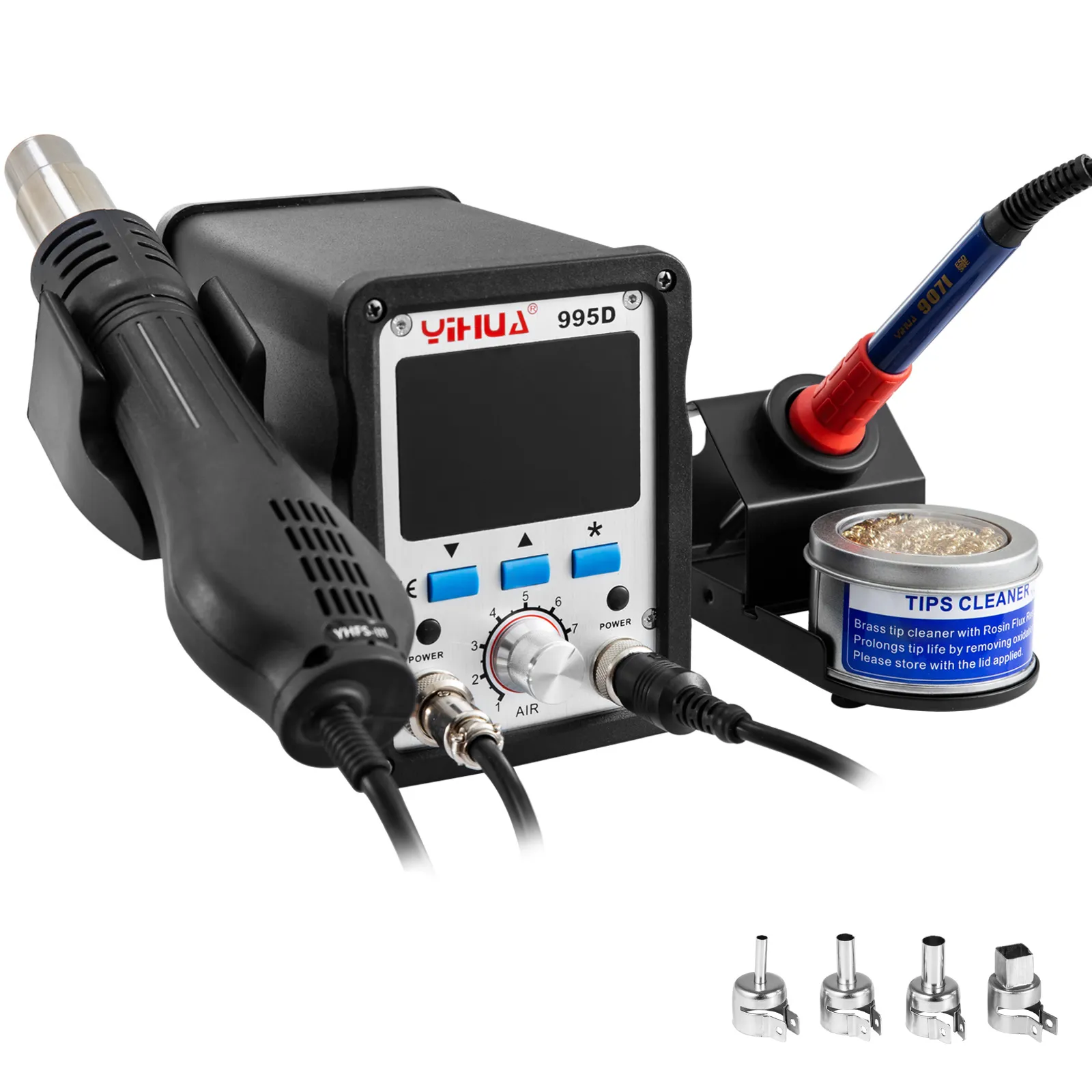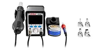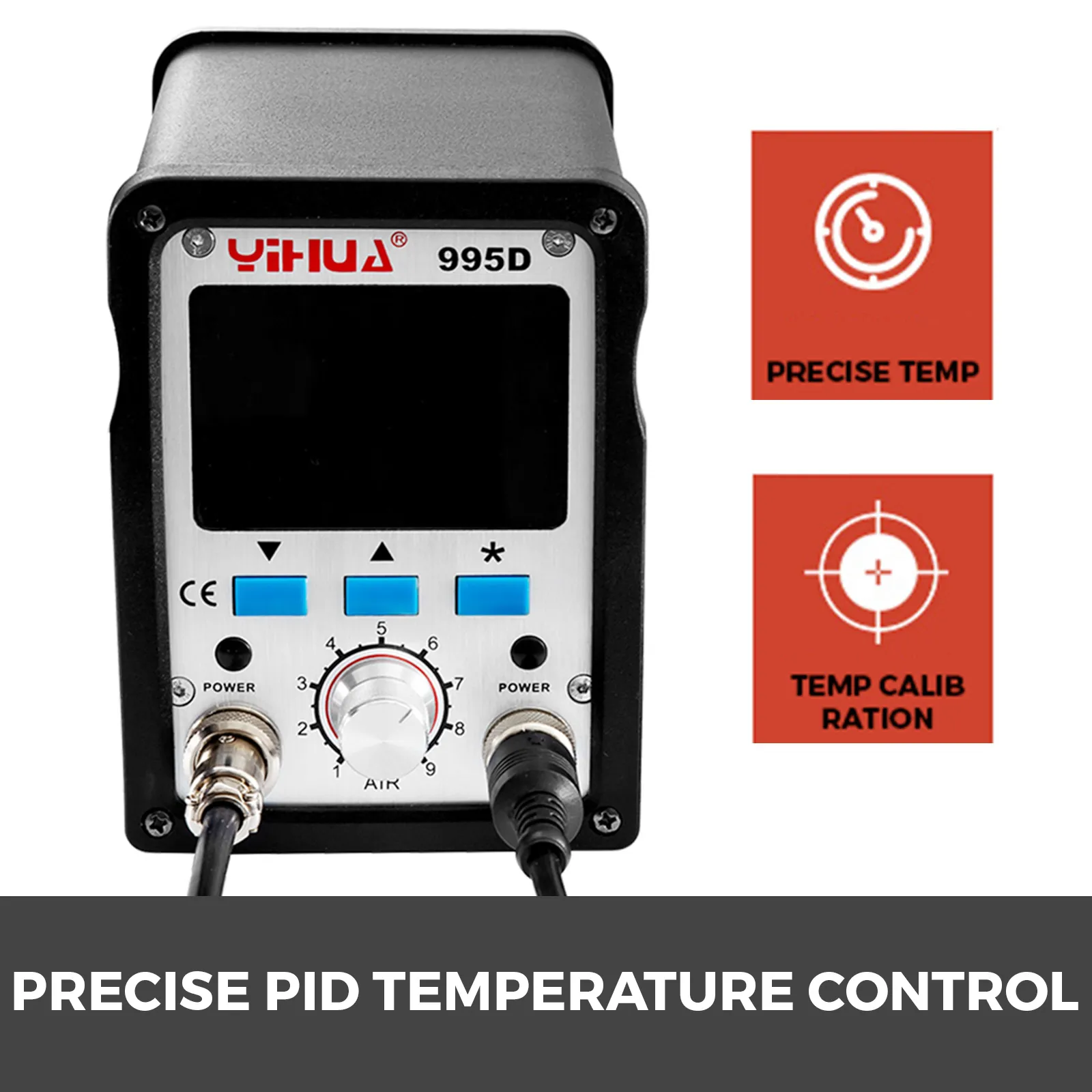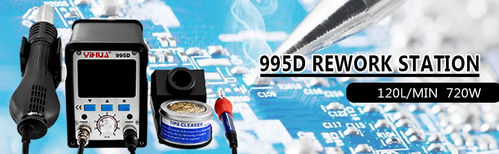 La stazione di rilavorazione 995D è progettata per dissaldare senza piombo. Utilizza la più recente tecnologia di controllo del programma PID del microprocessore per calcolare e produrre con precisione la giusta temperatura per l'uscita della pistola ad aria. La rapida regolazione della temperatura, l'uscita costante dell'aria fanno la scelta migliore per le esigenze della tua stazione di lavoro a caldo.