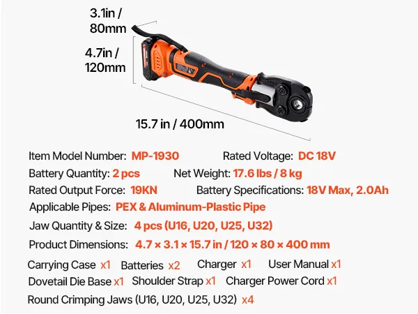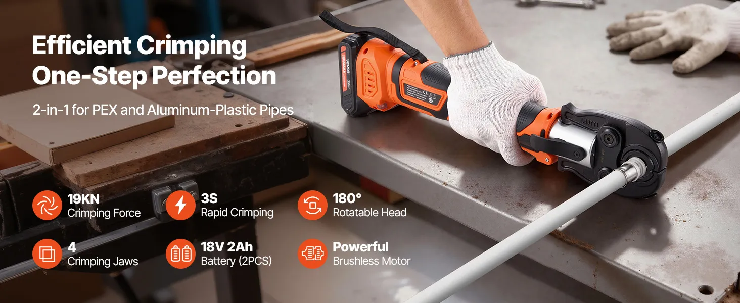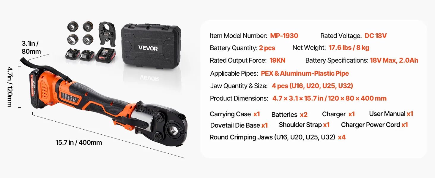 La pressatrice elettrica per tubi VEVOR da 18 V è dotata di 4 ganasce di crimpatura (U16 mm, U20 mm, U25 mm, U32 mm) progettate per tubi in PEX e alluminio-plastica. Dotata di un motore brushless ad alte prestazioni, garantisce crimpature rapide e senza perdite.