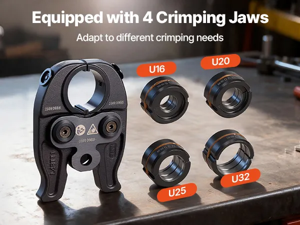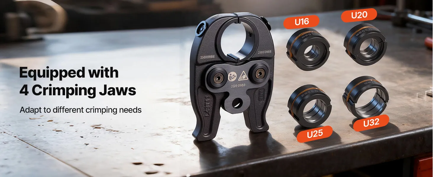 Include 4 ganasce intercambiabili (U16 mm, U20 mm, U25 mm, U32 mm), che offrono flessibilità di utilizzo per tubi di diverse dimensioni. Ottieni crimpature più rapide, precise e di alta qualità con facilità.