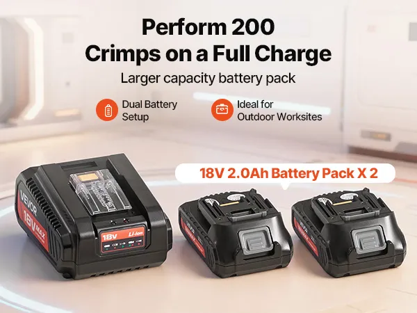 Dotato di due batterie da 2AH e di un caricabatterie rapido per un'autonomia prolungata e la massima praticità di lavoro all'aperto. Crimpa fino a 200 volte per carica, consentendo un funzionamento continuo senza interruzioni di corrente.