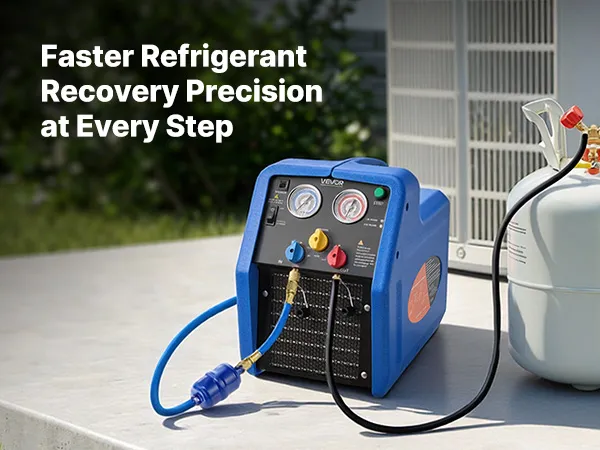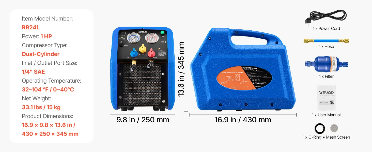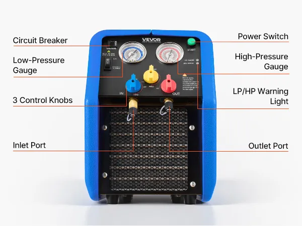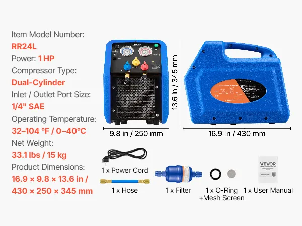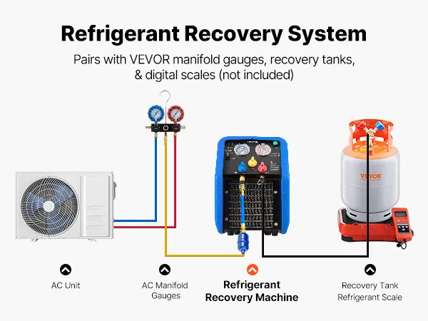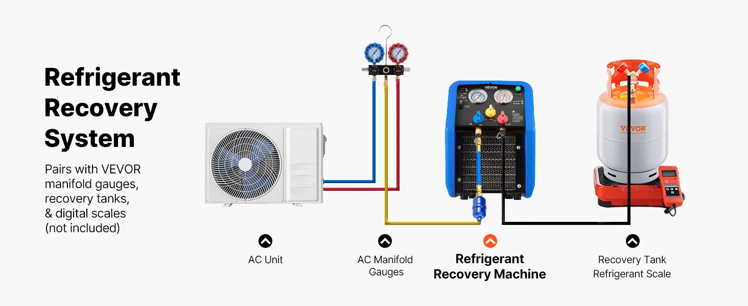 VEVOR Stazione di Recupero Refrigerante Portatile da 1 CV Macchina Recupero Refrigerante Doppio Cilindro per Sistema HVAC per Autoveicoli Velocità 1450 giri/min Temperatura di Lavoro 0–40 ℃