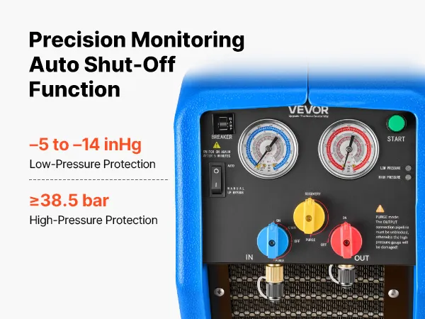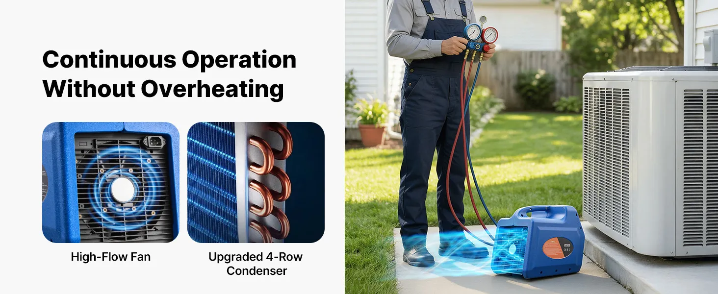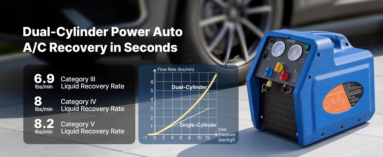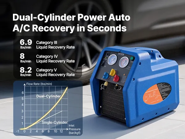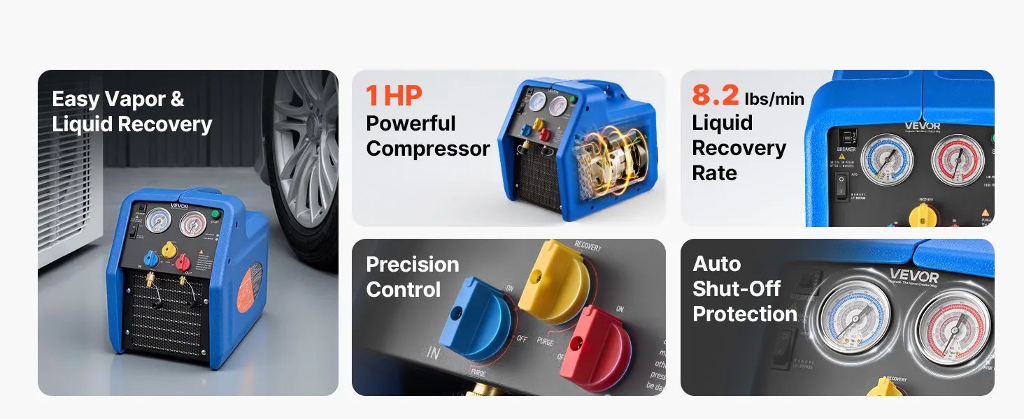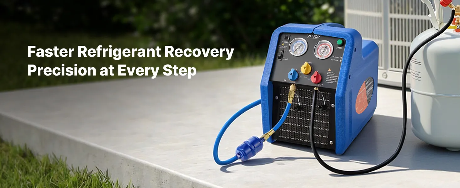 Recupero efficiente 3,7 kg/min: Questa unità portatile di recupero refrigerante a due cilindri da 1 HP è progettata per il recupero efficiente di refrigeranti liquidi e gassosi. Con una velocità di recupero del liquido fino a 3,7 kg/min, riduce significativamente i tempi di funzionamento
