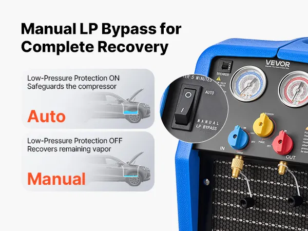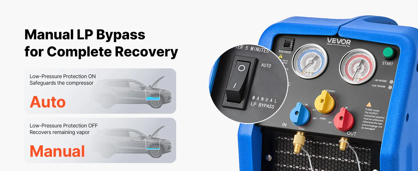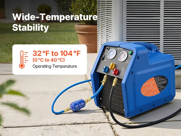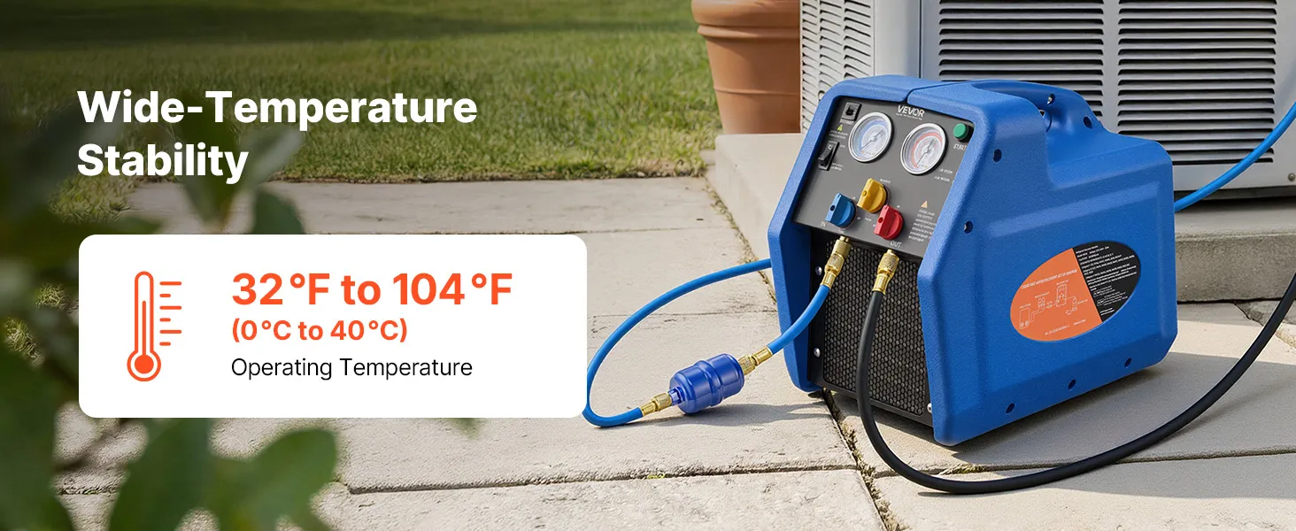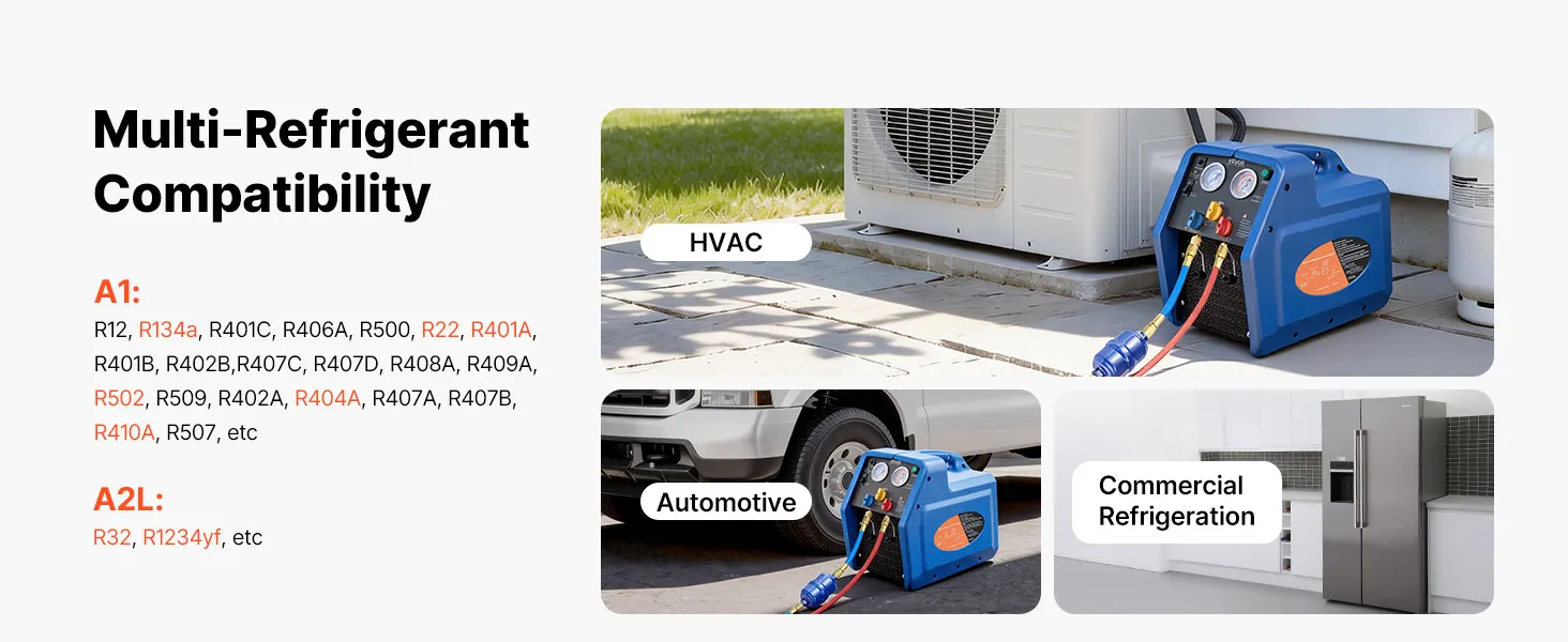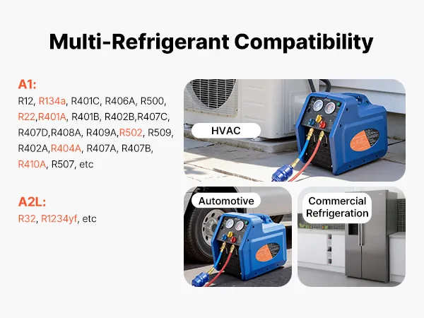 Ampia compatibilità: La nostra stazione di recupero refrigerante è compatibile con i refrigeranti di classe A1 (R12, R401A, R404A, R134a, R22, R407C, R407A, R407B, R410A, R507) e A2L (R32, R1234yf). Ideale per sistemi HVAC residenziali e aria condizionata per autoveicoli