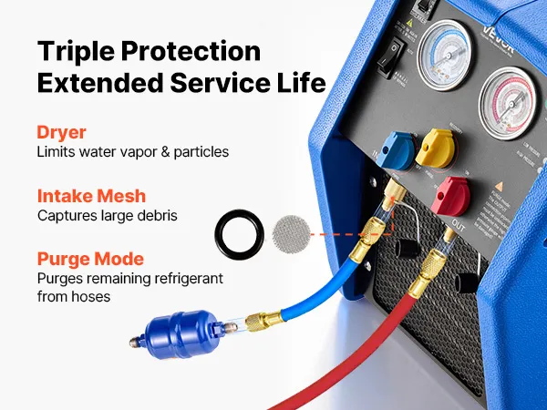 Filtro essiccatore: Dotato di un doppio sistema di filtrazione, questo recuperatore di refrigerante utilizza un filtro essiccatore e una membrana filtrante per estrarre impurità e vapore acqueo dal refrigerante. Il recupero di refrigerante pulito e disidratato preserva l'integrità dei componenti interni