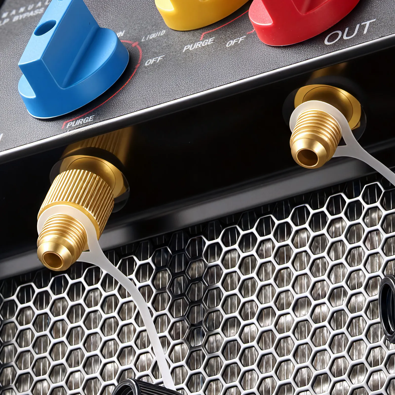 La filettatura di precisione di questa macchina per il recupero del refrigerante garantisce collegamenti sicuri dei tubi flessibili durante il funzionamento. I tappi antipolvere proteggono le porte quando la macchina non è in uso.
