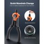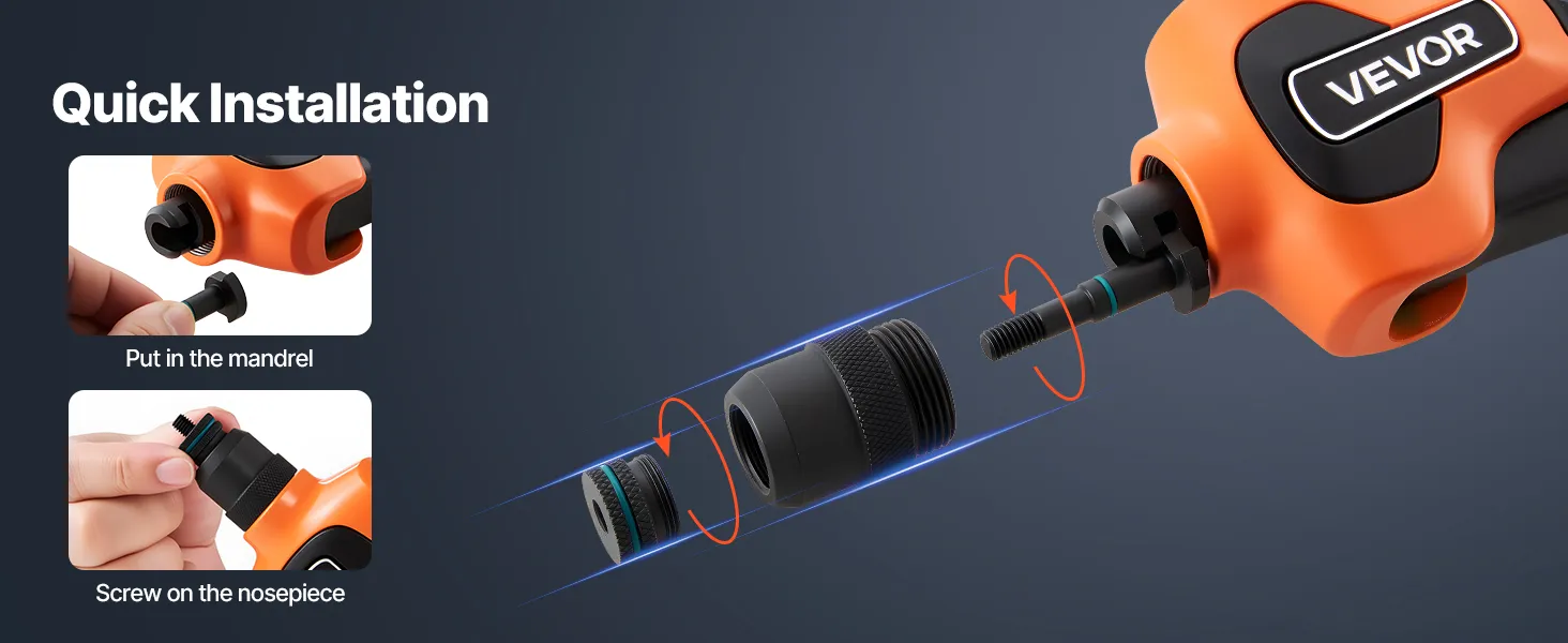 Cambia dimensione senza sforzo: cambia tra 7 dimensioni di mandrino in pochi secondi, senza bisogno di attrezzi. Ogni dimensione è chiaramente contrassegnata per un rapido riconoscimento, rendendo l'utensile per rivetti facile da usare