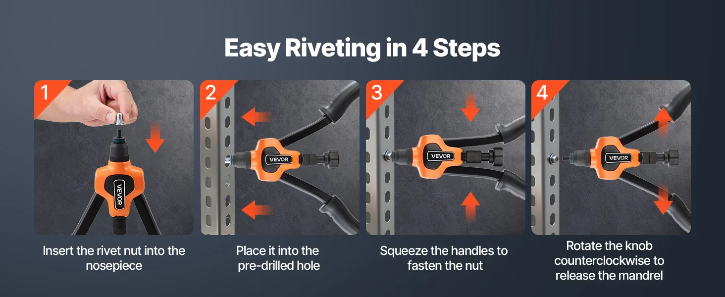 Funzionamento intuitivo: premere 2-3 volte per fissare, quindi ruotare per espellere: fluido ed efficiente ogni volta. Progettato sia per professionisti che per utenti fai da te, questo utensile per rivetti filettati garantisce fissaggio affidabile