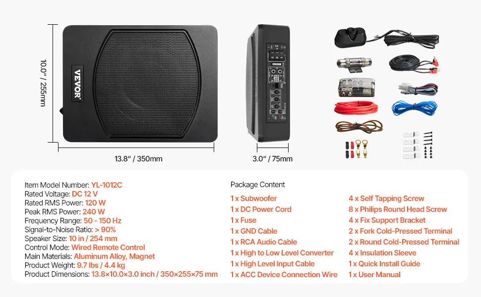 Compatibile con tutti i tipi di veicoli (auto, SUV, camion e camper), questo subwoofer si integra perfettamente con il tuo sistema audio tramite il cavo audio RCA o il cavo di ingresso ad alto livello.