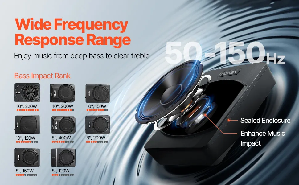 Esperienza di bassi potenti: l'ampia gamma di risposta in frequenza da 50 a 150 Hz copre lo spettro essenziale delle basse frequenze, offrendo un'esperienza uditiva più bilanciata e completa dai bassi agli acuti. L'involucro sigillato migliora la profondità e l'impatto della musica.