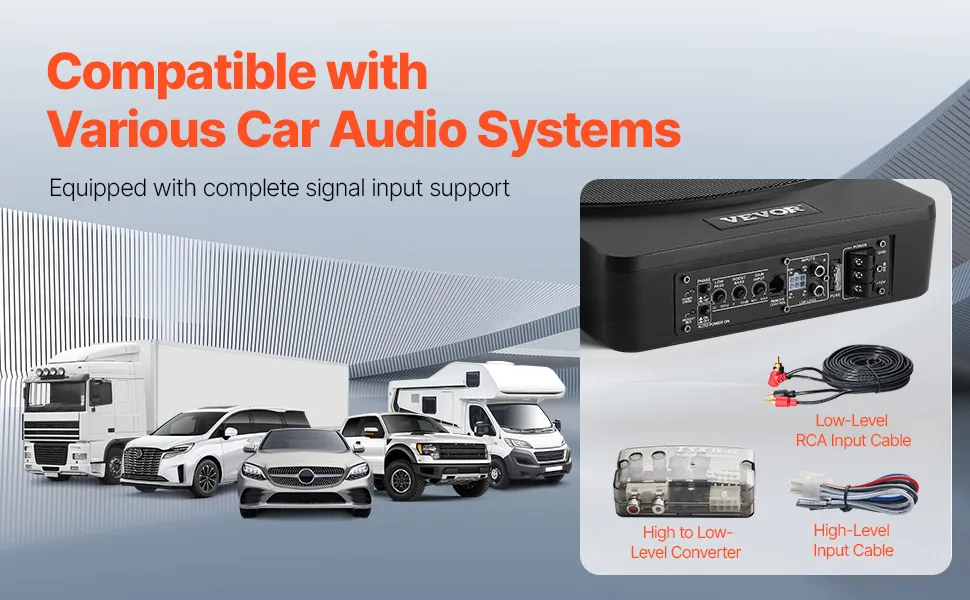 Altamente compatibile: questo subwoofer per autocarri sottosedile offre molteplici opzioni di ingresso del segnale, supportando sia ingressi RCA di basso livello che ingressi di alto livello. Include anche un convertitore di livello alto-basso.