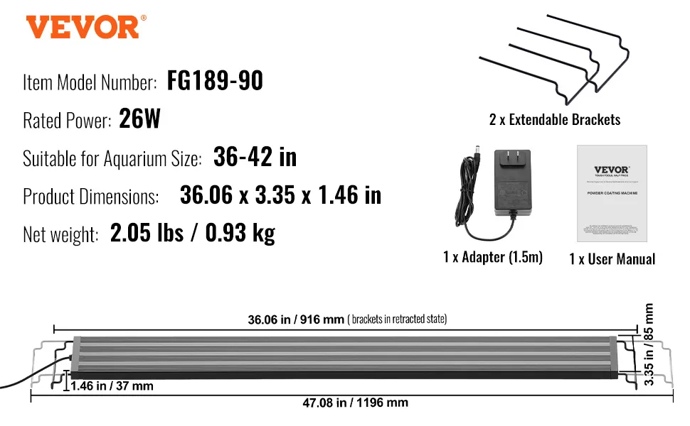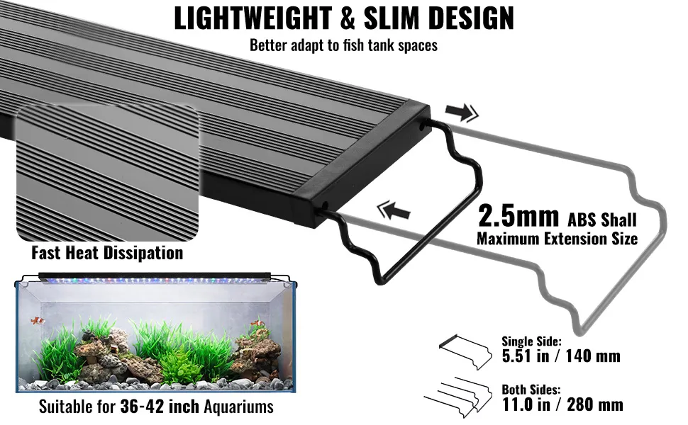 Ampie applicazioni: progettate per acquari da 91,44 a 106,68 cm/36 a 42 pollici, le luci LED per acquari VEVOR hanno 2 staffe estensibili con un'estensione massima su un lato di 13,97 cm/5,5 pollici e un'estensione su doppio lato di 27,94 cm/11 pollici, che le rende facili da installare sulla maggior parte dei serbatoi per acquari in vetro o acrilico con cappuccio/coperchio trasparente o senza, con bordo o senza bordo. Adatto sia agli appassionati di acquari principianti che esperti.