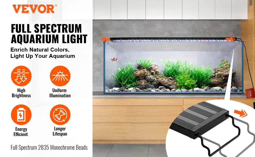 Con LED monocromatici 2835 a cinque file a spettro completo, 5 livelli di luminosità, timer regolabile, la luce per acquario VEVOR offre elevata luminosità, illuminazione uniforme ed efficienza energetica, dando vita al tuo acquario e creando un vivido mondo sottomarino.