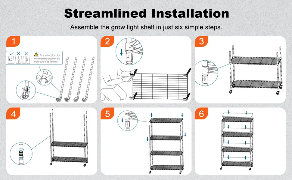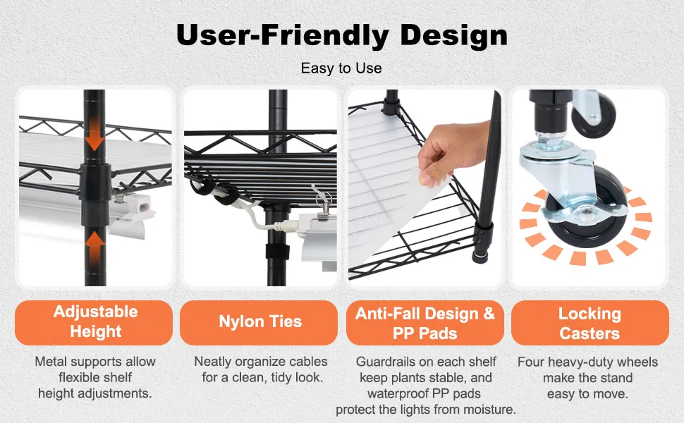 Design comodo e sicuro: la serra interna è dotata di altezza della griglia regolabile che si adatta a piante di varie dimensioni. Quattro ruote industriali resistenti rendono lo spostamento del rack senza sforzo.