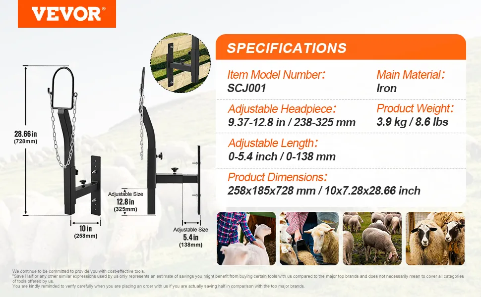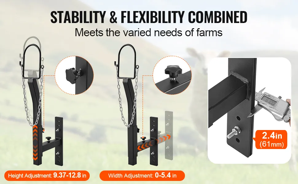 Adattabilità versatile: che si tratti di bestiame grande o piccolo, il nostro supporto per capre si adatta facilmente. L'altezza regolabile da 9,37 a 12,8 pollici/238-325 mm e la larghezza da 0 a 5,4 pollici/da 0 a 138 mm consentono di gestire bestiame di varie dimensioni.
