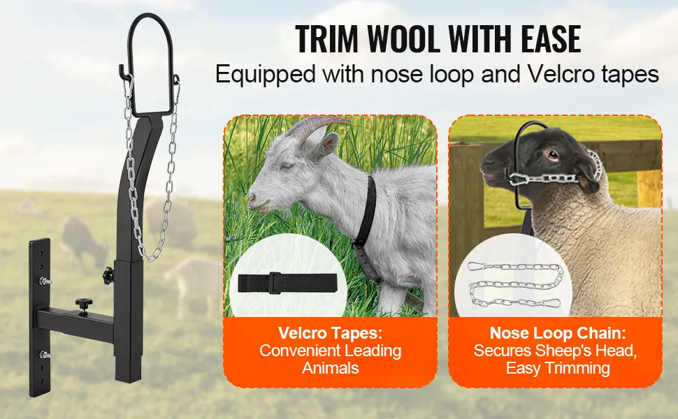 Utilizzando le cinghie in velcro, puoi condurre facilmente le pecore dalla fattoria al banco di mungitura delle capre. Una volta in posizione, la catenella ad anello per il naso stabilizza la testa, facilitando il taglio della lana. Niente più pecore poco collaborative!