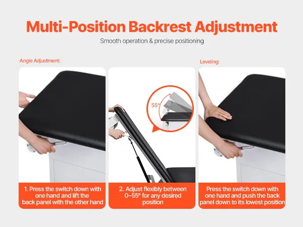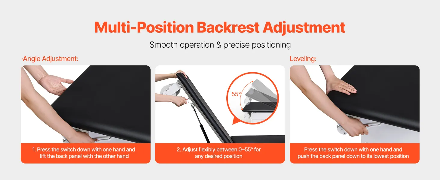 Lo schienale è regolabile in modo flessibile da 0° a 55° (±5°) per soddisfare le diverse esigenze di esame, garantendo un maggiore comfort per i pazienti e una maggiore efficienza per il personale medico.