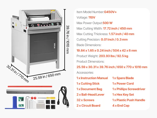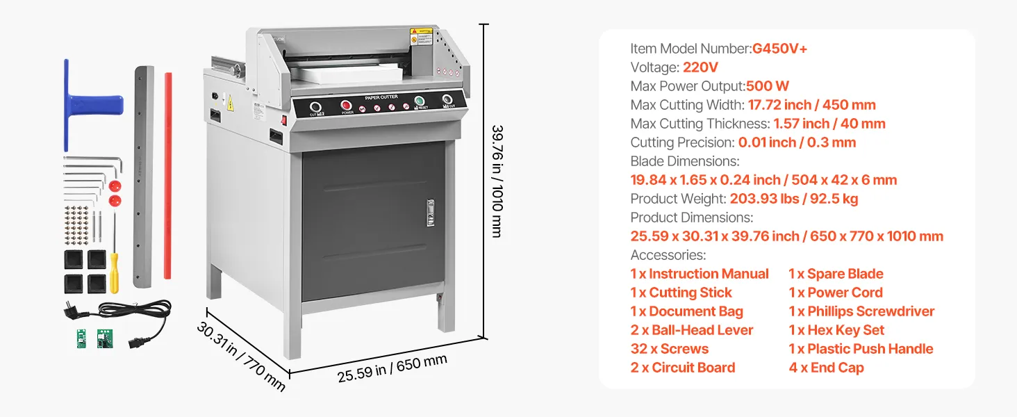 One-Pass Large & Thick Cutting: The electric paper cutter cuts up to 17.72 inch / 450 mm width and 1.57 inch / 40 mm thickness in one pass. It can handle bulk paper stacks, books, and cardstock efficiently, saving time and labor