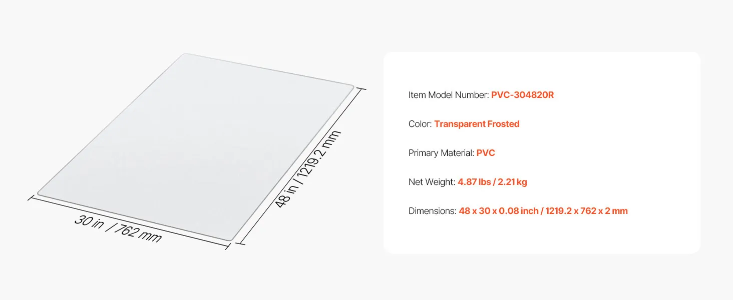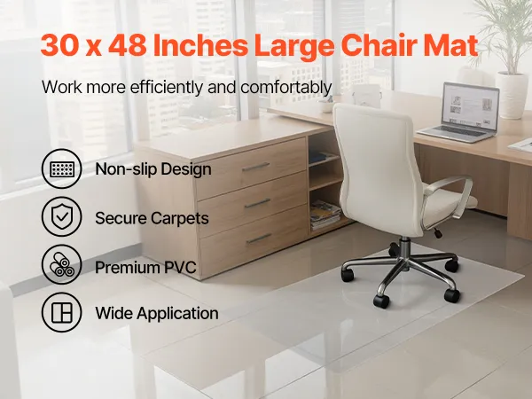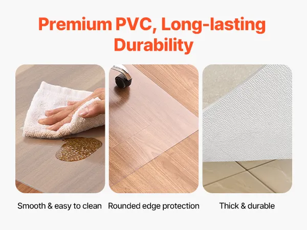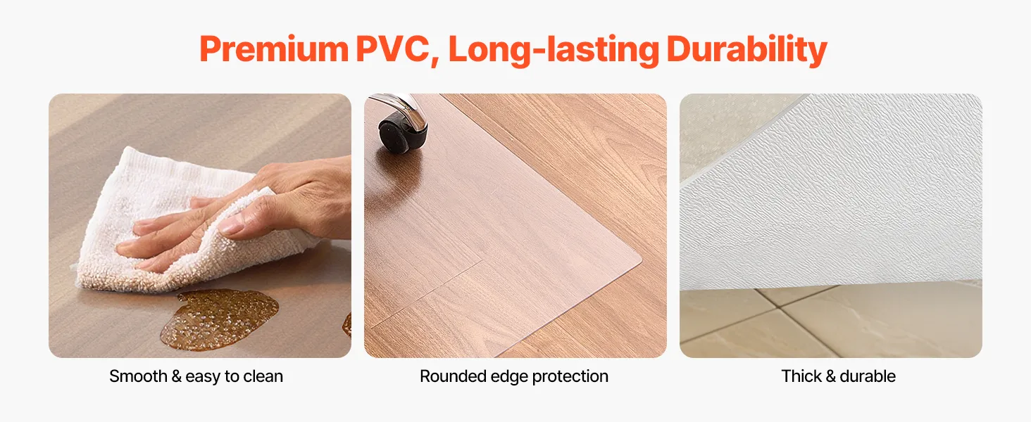 Resistente e robusto: realizzato in PVC di alta qualità da 1,91 mm di spessore, questo tappeto sotto la scrivania resiste a deformazioni e crepe. La finitura opaca trasparente è impermeabile e le macchie si puliscono facilmente, garantendo una lunga durata