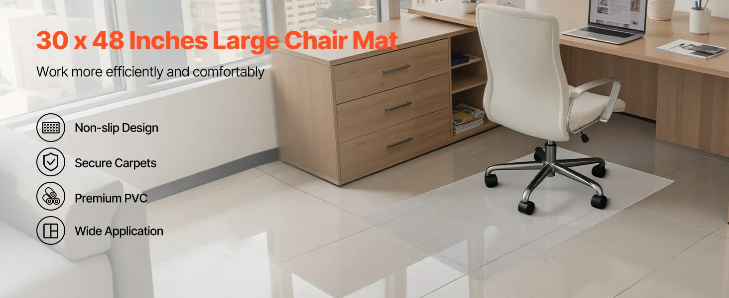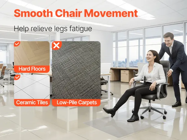 Questo tappetino per sedie rettangolare di grandi dimensioni copre ampiamente l'area di movimento, adatto a uffici di piccole e medie dimensioni.