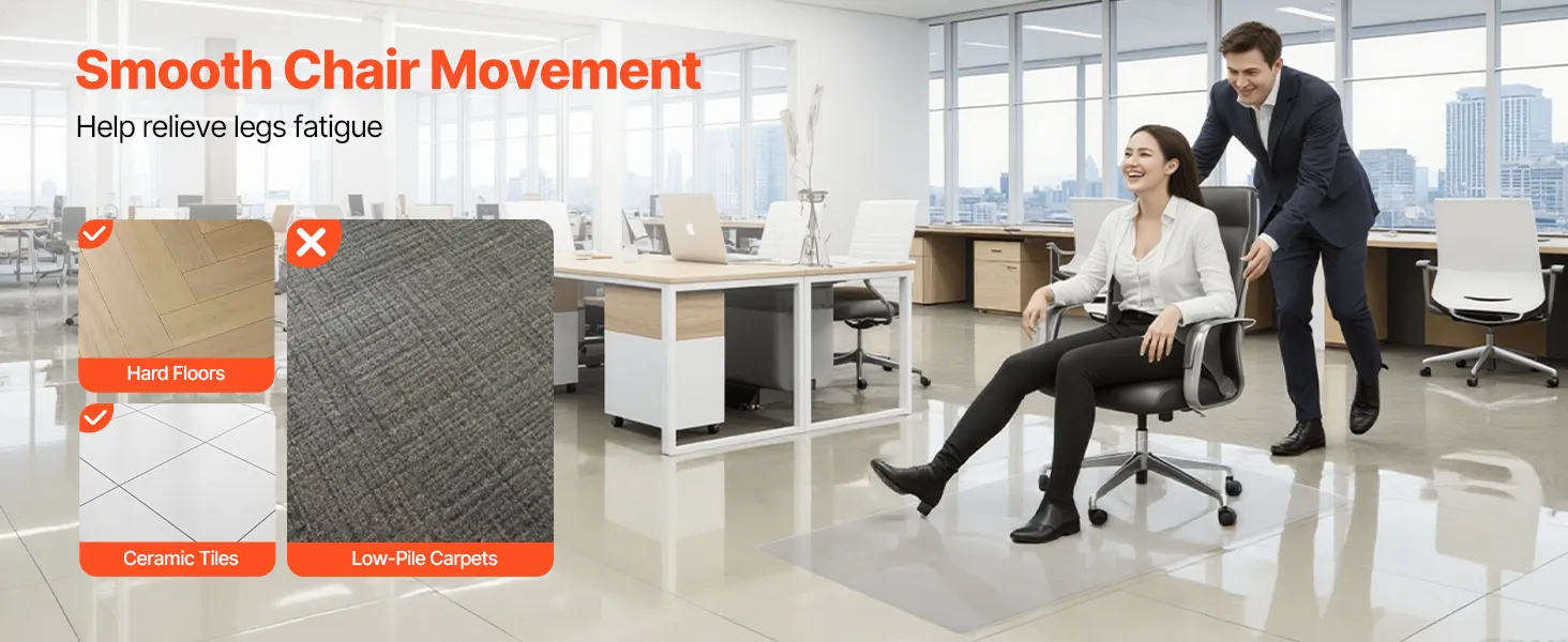 La superficie liscia del nostro tappeto sotto la scrivania permette alla sedia di scivolare senza sforzo. Il design ergonomico riduce la pressione e l'affaticamento delle gambe, rendendo le lunghe ore alla scrivania molto più confortevoli.