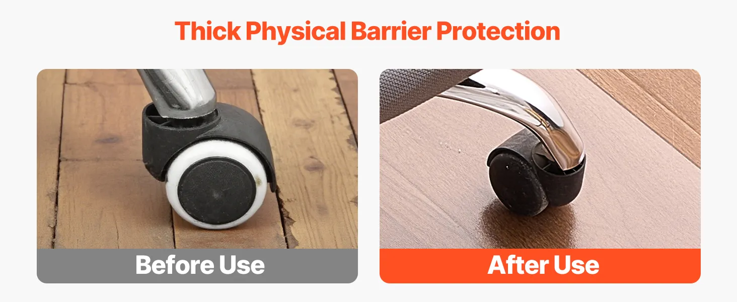 Lo spesso strato ammortizzante del tappetino trasparente assorbe la pressione delle ruote delle sedie, proteggendo il tappeto da ammaccature e graffi. Prolunga la durata del tappeto e riduce l'usura delle ruote delle sedie, mantenendolo come nuovo.