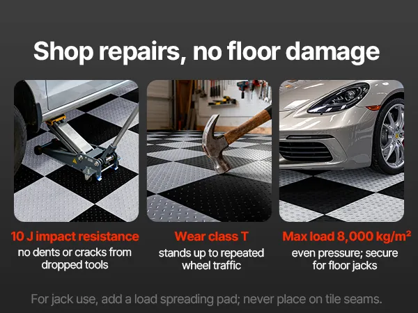 Supporto per carichi pesanti: carico massimo di 8000 kg/m² per SUV, camion e veicoli pesanti di grandi dimensioni. Le piastrelle in PVC per pavimenti da garage distribuiscono uniformemente il peso, evitando ammaccature e crepe nel tempo