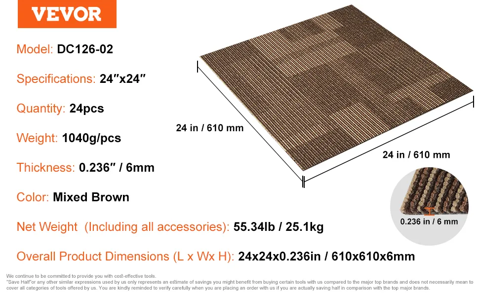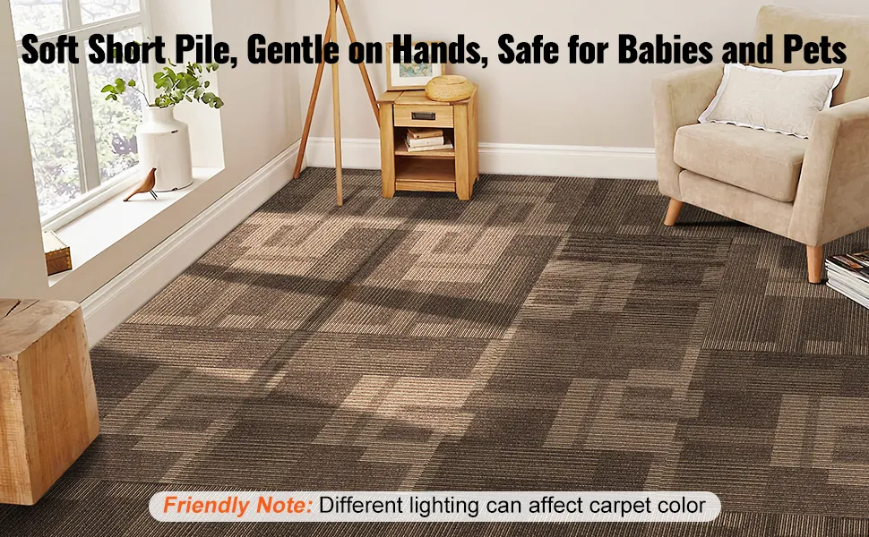 Questo colore marrone misto di piastrelle per moquette VEVOR aggiunge calore e stile a qualsiasi stanza. I toni ricchi e terrosi creano un'atmosfera accogliente e invitante. La combinazione di colori è versatile e si adatta bene a decine di stili di arredamento. Che tu abbia un arredamento moderno, tradizionale o eclettico, queste piastrelle si adatteranno perfettamente. Inoltre, il colore marrone misto aiuta a nascondere lo sporco e l'usura, assicurando che il tuo tappeto appaia bello più a lungo. Queste piastrelle aggiungono calore e raffinatezza alla tua casa con le piastrelle per moquette VEVOR.