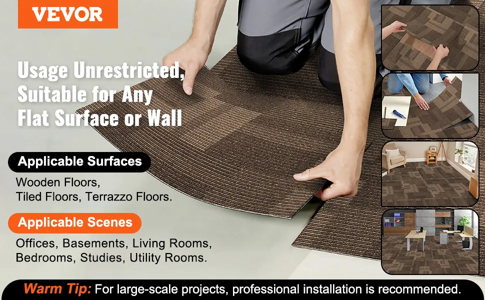 Ecco perché le piastrelle per moquette facili da installare VEVOR sono costruite per durare. Il supporto in asfalto è rinforzato con uno spessore di 0,236" e un peso di 1040 g/m². Ciò garantisce un'eccezionale resistenza all'usura. Il design durevole è ideale per aree ad alto traffico come soggiorni e corridoi. Queste piastrelle mantengono il loro aspetto e la loro struttura anche con un uso frequente. La costruzione robusta garantisce che la tua moquette rimanga in ottime condizioni per anni. Puoi affidarti a VEVOR per soluzioni per moquette durature e durevoli.