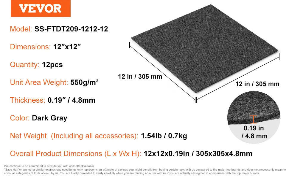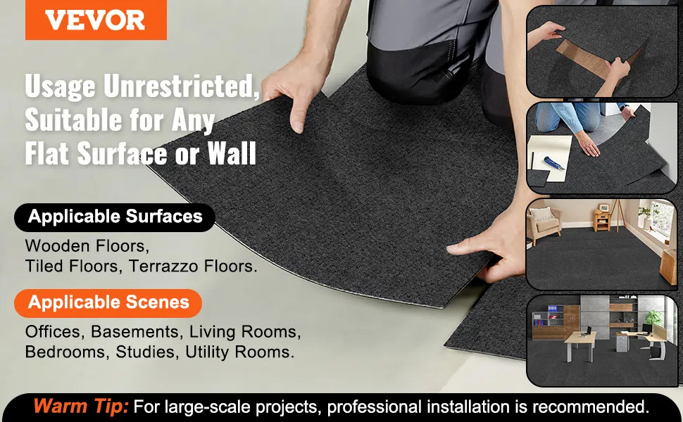 L'installazione delle piastrelle per moquette VEVOR peel-and-stick è semplice. La funzione peel-and-stick assicura una rapida installazione. Non c'è bisogno di aiuto professionale. Basta staccare la carta di supporto e aderire alle piastrelle. Questo lo rende ideale per gli amanti del fai da te. Puoi trasformare il tuo spazio in pochissimo tempo. È perfetto per coloro che vogliono evitare il fastidio di installazioni complesse. Puoi goderti il lusso di utilizzare la moquette VEVOR senza il solito trambusto. Il processo è semplice e intuitivo. Quindi, questo rende tutto accessibile a tutti, indipendentemente dall'esperienza che hai.