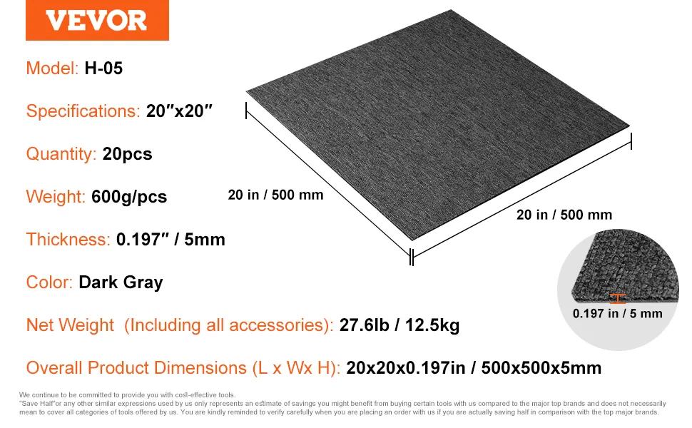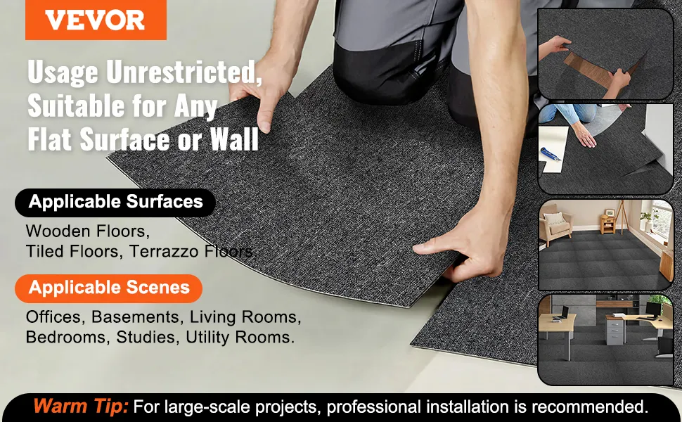 In termini di versatilità, le piastrelle per moquette VEVOR sono riutilizzabili e offrono la massima flessibilità. Ogni piastrella misura 20x20 pollici, creando un'area di 55,5 piedi quadrati. Ciò le rende ideali sia per ambienti interni che esterni. Puoi usarle nella tua camera da letto, soggiorno o ufficio. Il loro design modulare ti consente di personalizzare la disposizione per adattarla a qualsiasi spazio. Che tu debba coprire aree piccole o grandi, queste piastrelle possono adattarsi alle tue esigenze. Sono versatili e riutilizzabili, il che le rende opzioni incredibilmente pratiche per esigenze di design mutevoli o adattamenti stagionali. Quindi, il tuo spazio apparirà sempre fresco e invitante con questi quadrati di moquette 20x20.