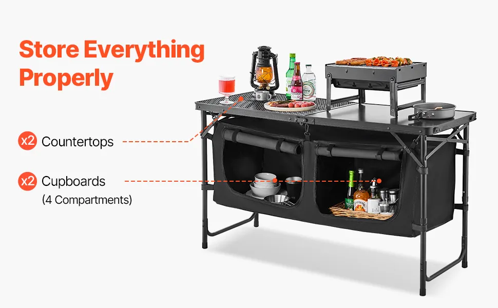 Organizzazione efficiente dello spazio: progettato per cucinare all'aperto, il nostro tavolo da cucina da campeggio ti consente di disporre ordinatamente cibo, fornelli, griglie e pentole sul suo tavolo e negli scomparti di stoccaggio con cerniera