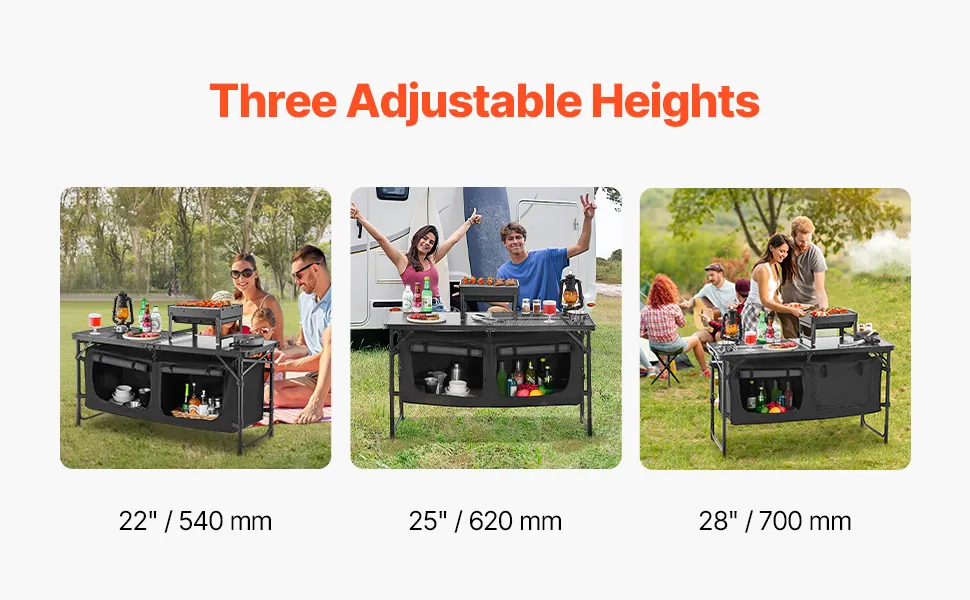VEVOR Tavolo da Cucina da Campeggio, 3 Altezze Regolabili, Stazione di Cottura Portatile Leggera in Alluminio con Organizzatore per Riporre Oggetti, Maniglia per Trasporto, per Barbecue, Feste, Nero