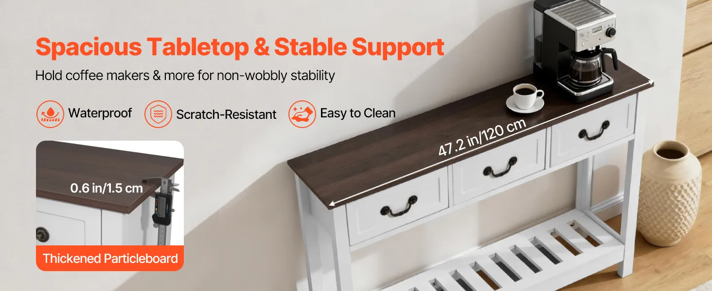 Il nostro tavolo da ingresso è dotato di un piano in truciolato spesso. Offre un supporto stabile per piccoli elettrodomestici e oggetti come macchine da caffè o i vostri quadri e cornici preferiti.