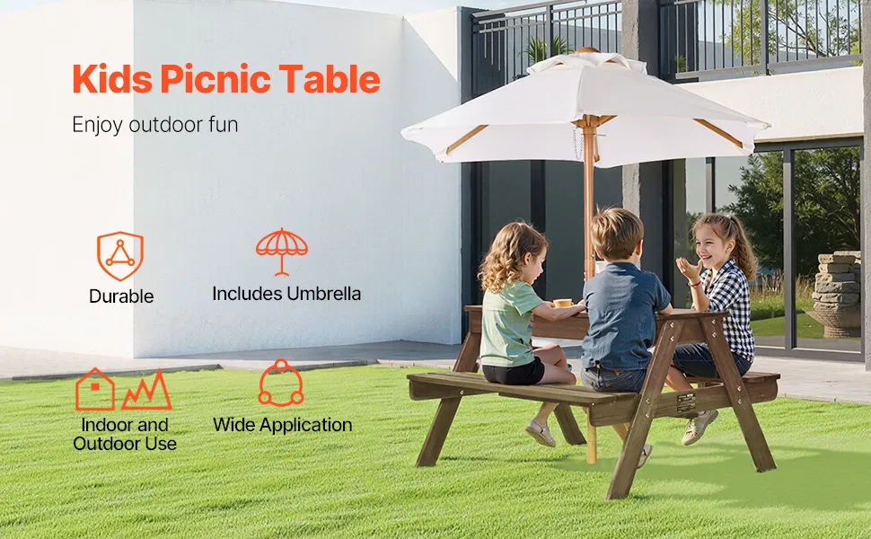VEVOR Tavolo da Picnic con Ombrellone da 890 x 800 x 510 mm Tavolo e Panca in Legno per Esterni con 2 Vassoi, Mobili da Pranzo per Patio per 4 Persone per Giardino, Cortile e Veranda, Noce