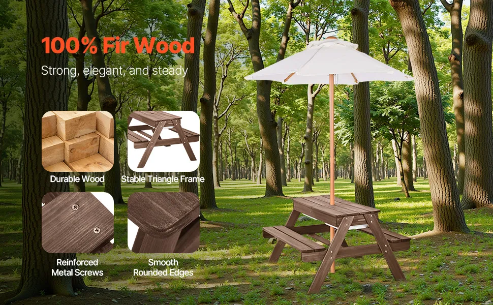 Questo tavolo da picnic per esterni è realizzato in legno di abete di alta qualità, rinforzato con una stabile struttura triangolare e viti metalliche per una maggiore durata e capacità di carico.