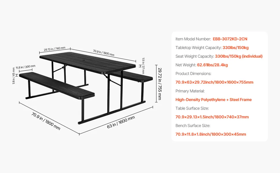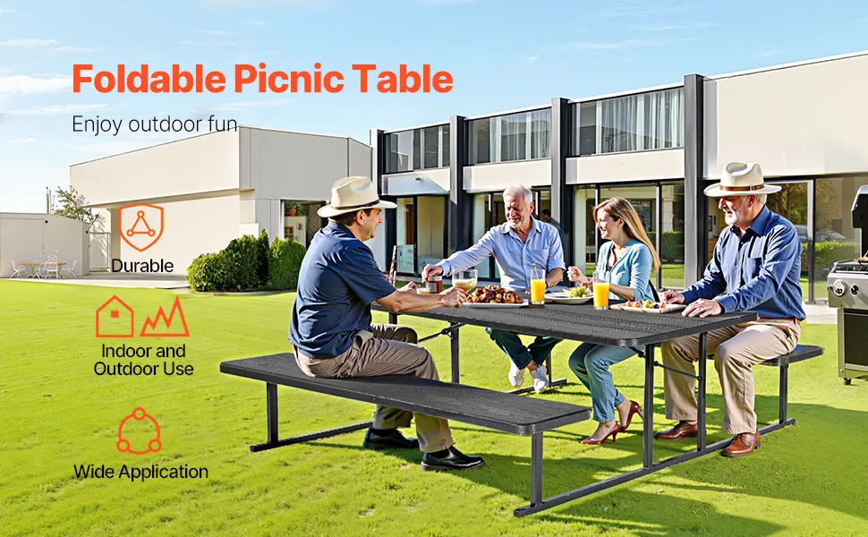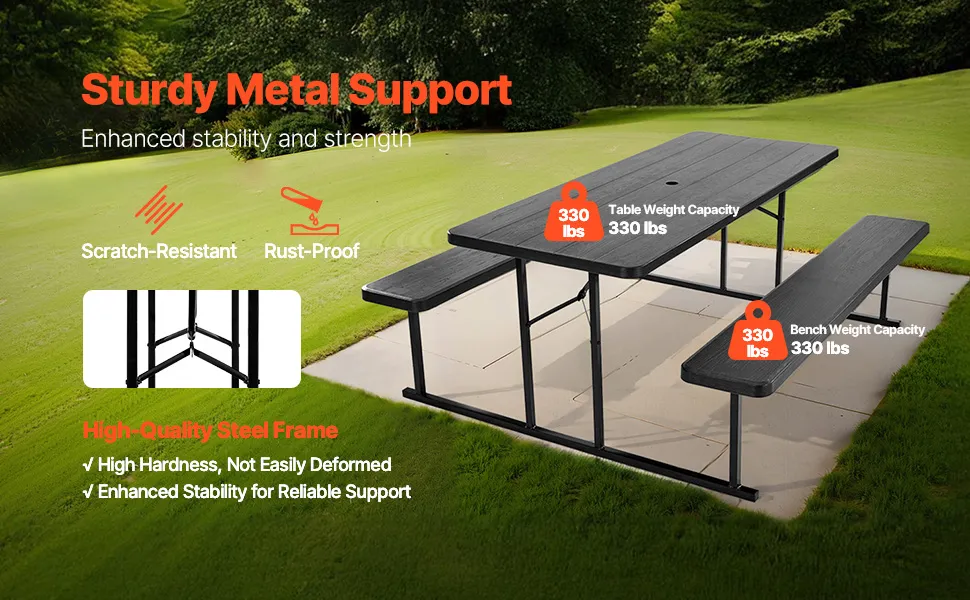 Stabile e durevole: il piano del tavolo da picnic all'aperto è realizzato in polietilene ad alta densità, che ne aumenta la longevità all'aperto con un'eccellente resistenza alle intemperie. Il piano del tavolo supporta fino a 330 libbre/150 kg, mentre ogni seduta può sostenere 330 libbre/150 kg, ospitando 6-8 persone per un'esperienza di seduta stabile e sicura