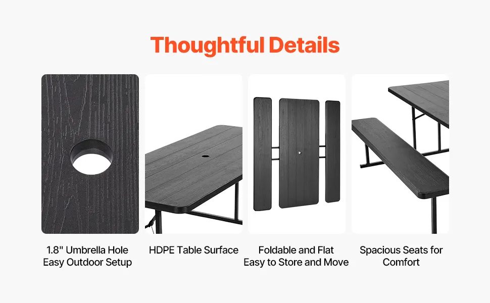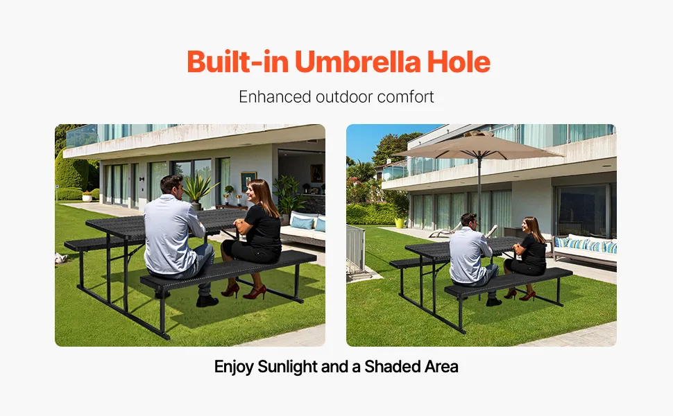 VEVOR Tavolo da Picnic Pieghevole 1795 x 1600 x 755 mm con Panche, Set di Panche da Esterno in Acciaio con Foro per Ombrellone, Grande Tavolo da Pranzo Esterno per Patio, Giardino, Bordo Piscina, Nero