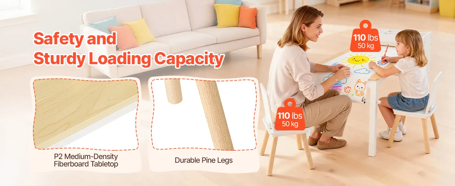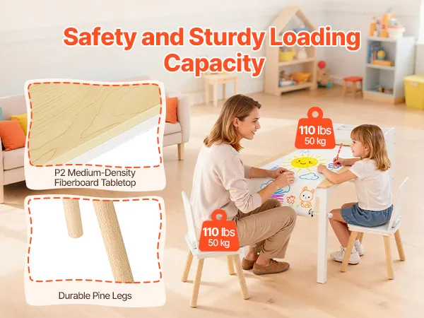 Sicuro e robusto: il nostro tavolo da lavoro per bambini è dotato di robuste gambe in pino e pannelli in MDF P2 per una lunga durata. Il tavolo e le sedie supportano fino a 49,9 kg