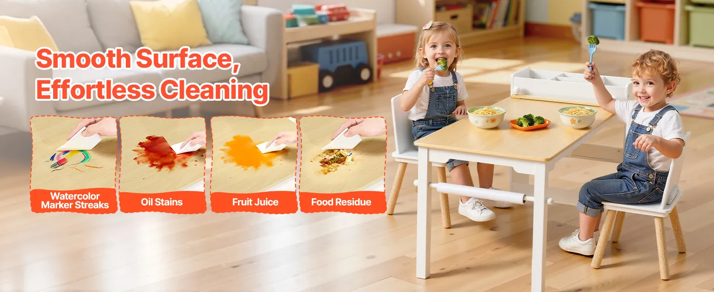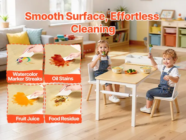 Facile da pulire: la superficie liscia e impermeabile di questo tavolo da gioco per bambini è repellente a sporco e briciole. Basta pulirlo con un panno umido per mantenerlo pulito