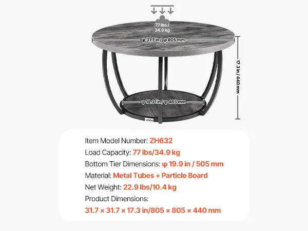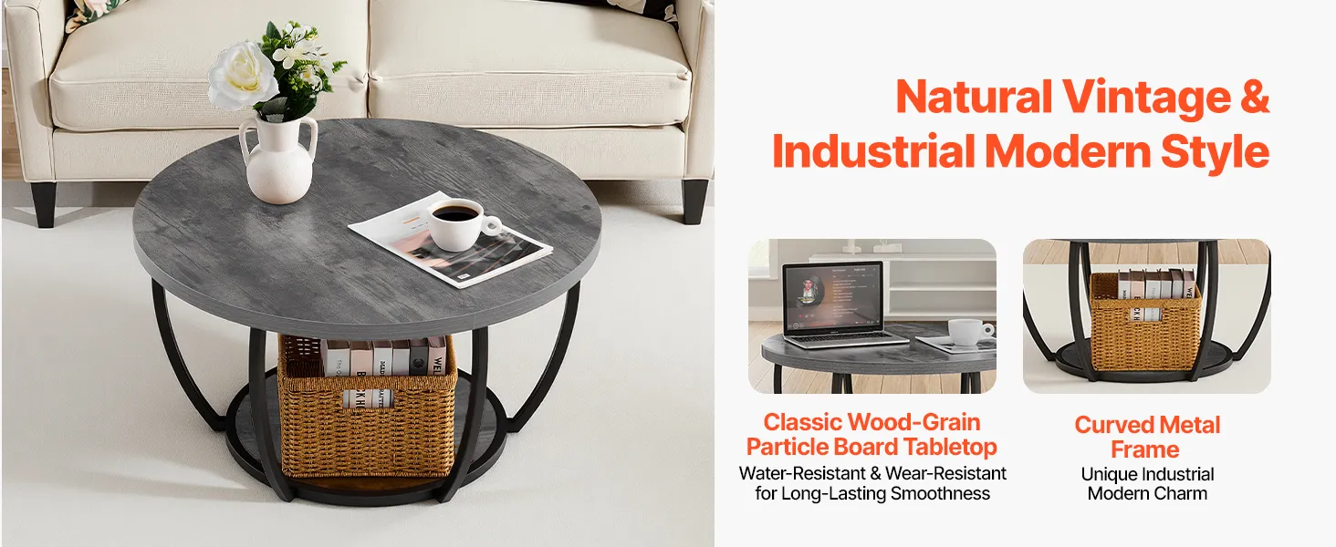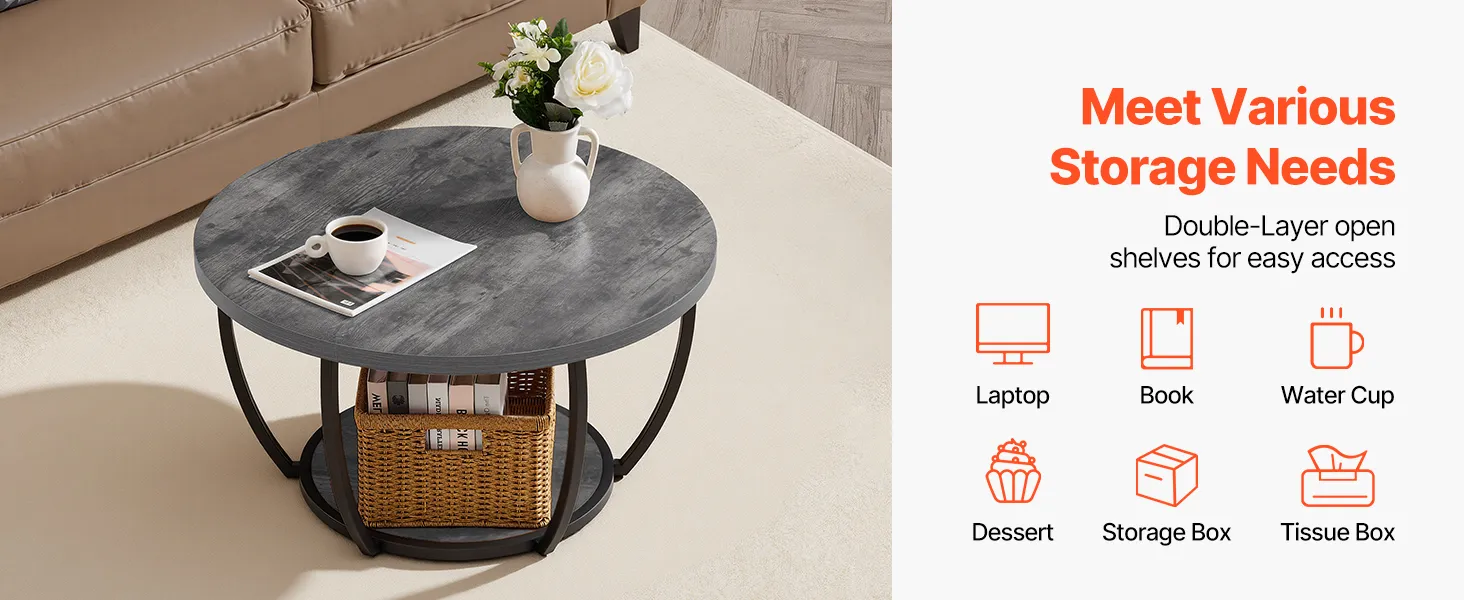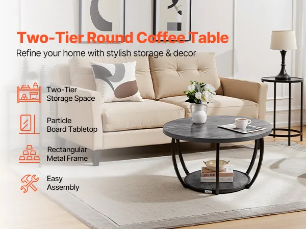 VEVOR Tavolino Laterale Rotondo Tavolino da Divano a Due Livelli con Struttura in Metallo e Spazio Aperto e Carico di 34,9 kg, Tavolo da Soggiorno Minimalista da 80,5 x 80,5 x 44 cm Grigio