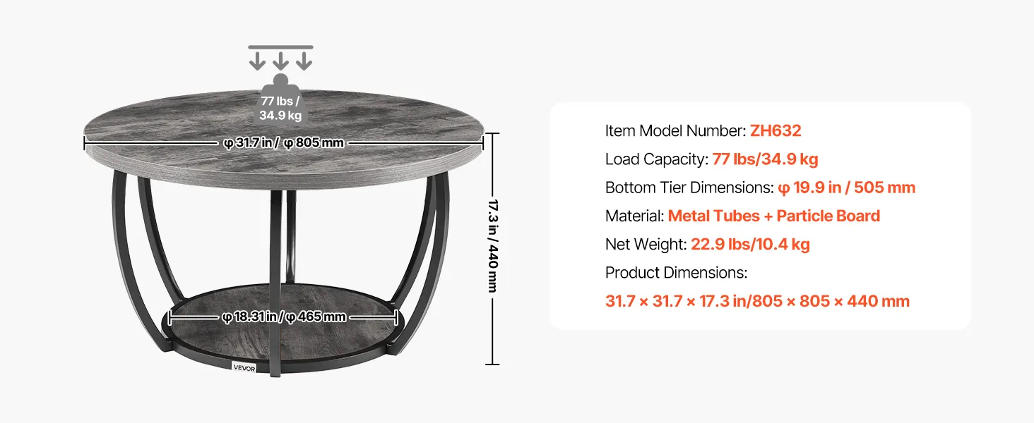Design a due livelli: il piano rotondo del tavolino da caffè, con un diametro di 80,5 cm, offre spazio per libri, bicchieri d'acqua. Inoltre, presenta un ripiano inferiore largo 46,5 cm per gli oggetti di uso quotidiano più piccoli