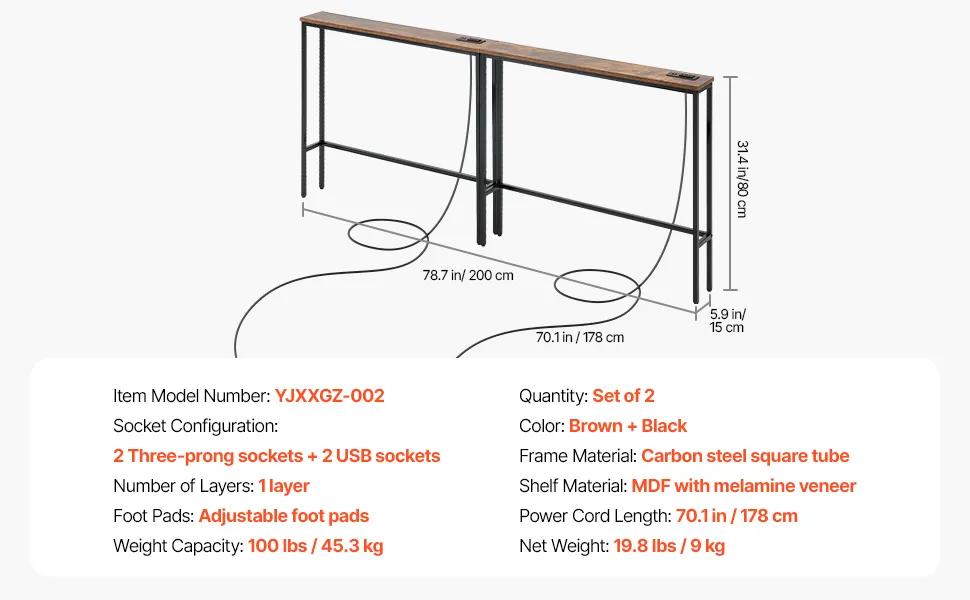 VEVOR Tavolino da Divano Stretto Dietro, 2 Pezzi con Prese di Corrente, Tavolo d'Ingresso Lungo a 1 Piano con Struttura in Metallo e Stazione di Ricarica, per Ingresso, Corridoio, Soggiorno
