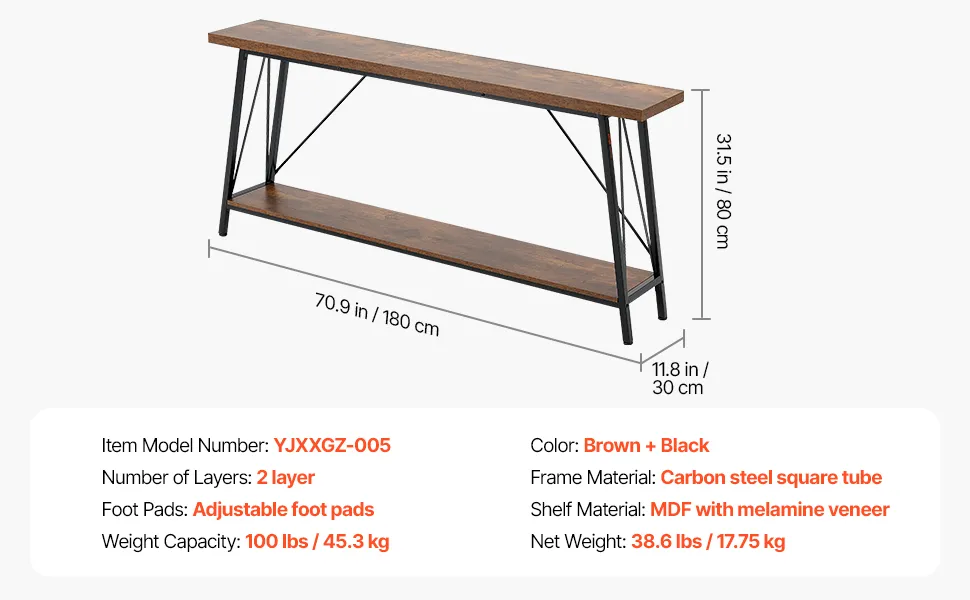 VEVOR Tavolo Stretto Dietro Divano, Tavolino da Ingresso Lungo a 2 Livelli e Tavolo da Corridoio Sottile, con Struttura in Metallo, per Ingresso, Corridoio, Soggiorno, 180 x 30 x 80 cm