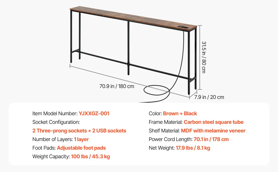 VEVOR Tavolo Stretto Dietro Divano, 180 x 20 x 80 cm, con Prese di Corrente, Tavolino d'Ingresso Lungo a 1 Livello con Struttura in Metallo e Stazione di Ricarica, per Ingresso, Corridoio