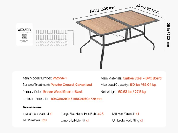 VEVOR Tavolo da Pranzo per Esterni, Tavolo da Bistrot da Giardino Rettangolare con Doghe in Acciaio Effetto Legno da 150 cm, con Foro per Ombrellone da 38 mm, Mobili da Esterno per Prato, Giardino