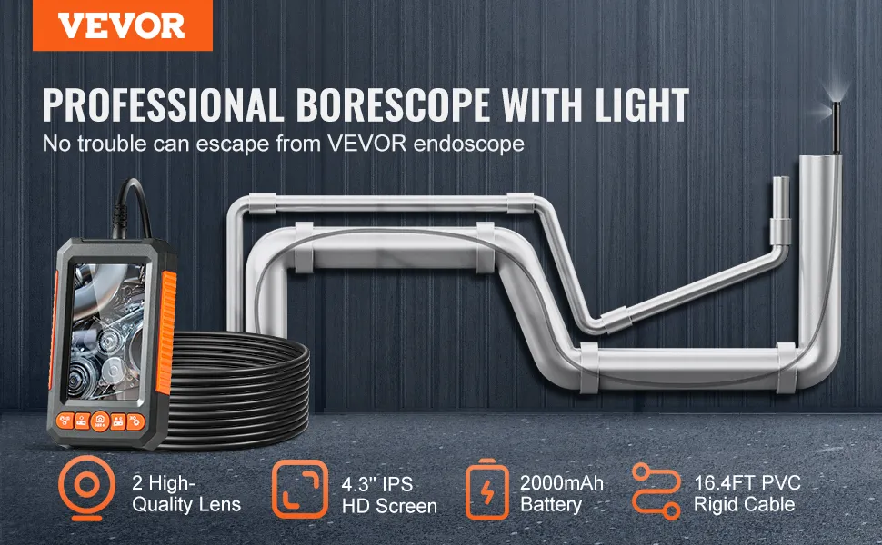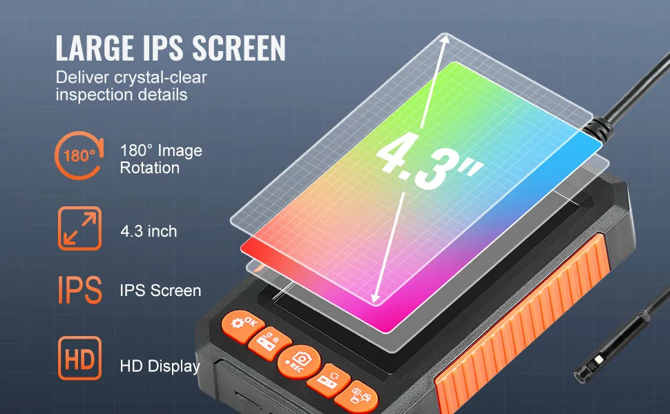 Questa telecamera endoscopica a doppia lente offre una visione più ampia. È possibile alternare l'una con l'altra per scattare foto o registrare video. Il cavo flessibile da 5 metri consente di raggiungere aree ristrette in veicoli, pareti e tubazioni. Il display LCD da 4,3" fornisce video in tempo reale durante il lavoro. La sonda sottile impermeabile svolge il suo lavoro anche in ambienti umidi.