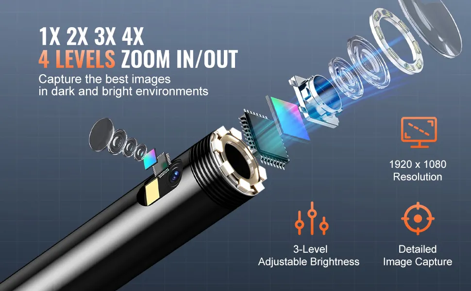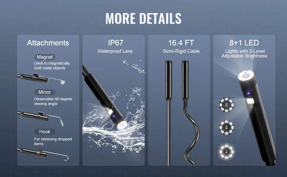 Le luci LED luminose consentono di vedere anche in zone buie. L'obiettivo ad alta risoluzione fornisce immagini e video nitidi. È possibile memorizzarli sul dispositivo o trasferirli tramite USB. Ideale per auto, lavori idraulici e progetti domestici. È leggero, compatto e portatile ovunque.