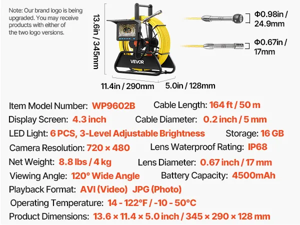 La telecamera per fognature VEVOR da 50 m rende le ispezioni delle condotte più rapide e semplici. Dotata di schermo a colori da 4,3 pollici, 6 LED regolabili, batteria ricaricabile da 4500 mAh, marcature della lunghezza del cavo e grado di impermeabilità IP68.